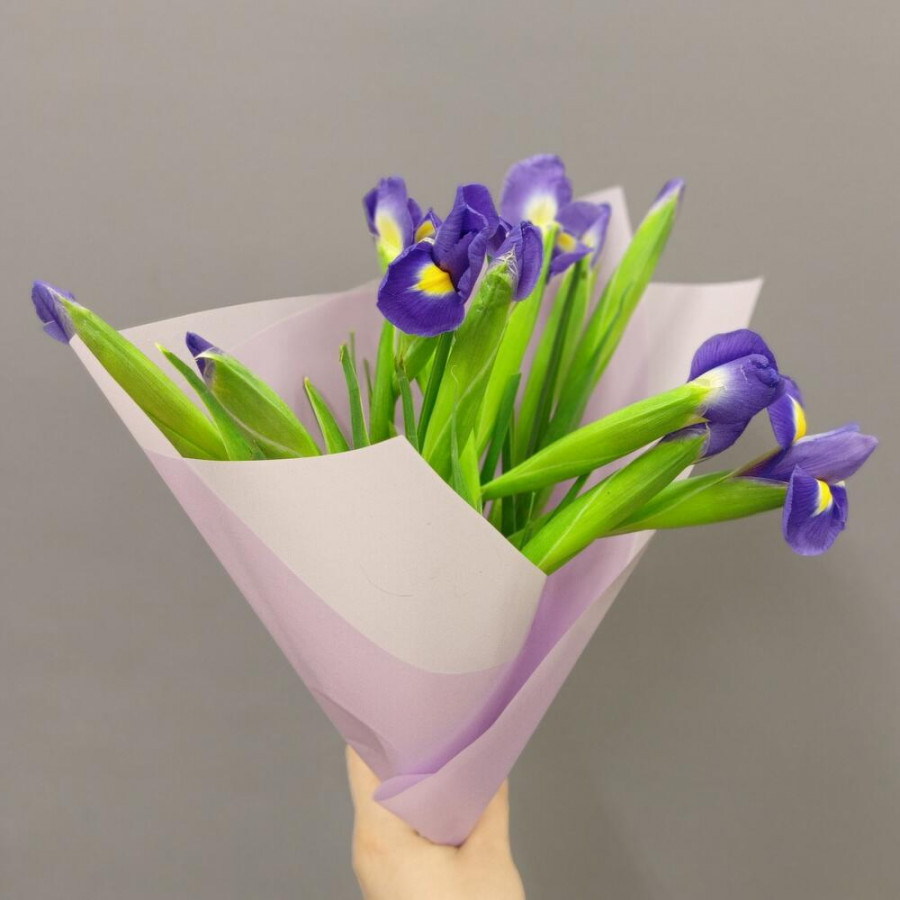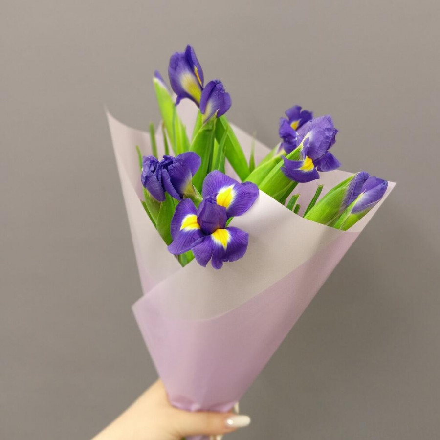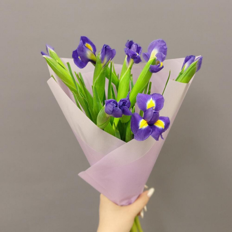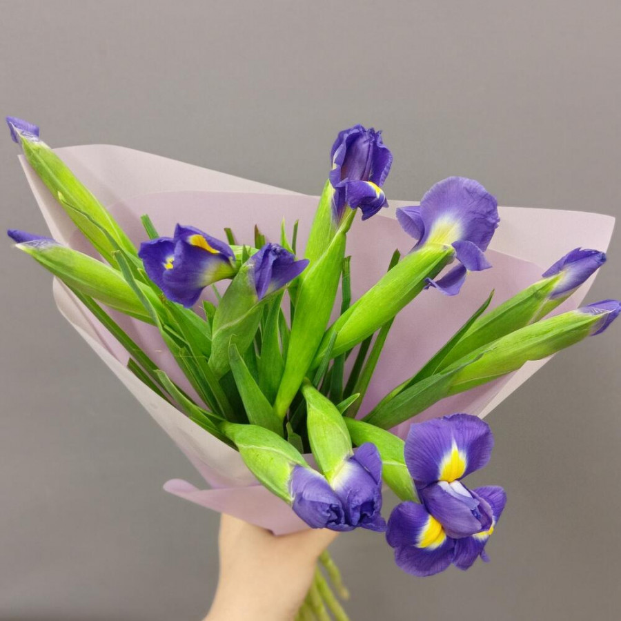 На фото букет из 11 синих ирисов. В составе: ирис 11 шт, дизайнерская упаковка 1 шт, атласная лента 1 шт, . Все цветы свежие и ароматные, букет красиво оформлен и отлично подходит для подарка. Доступна доставка цветов или самовывоз.
